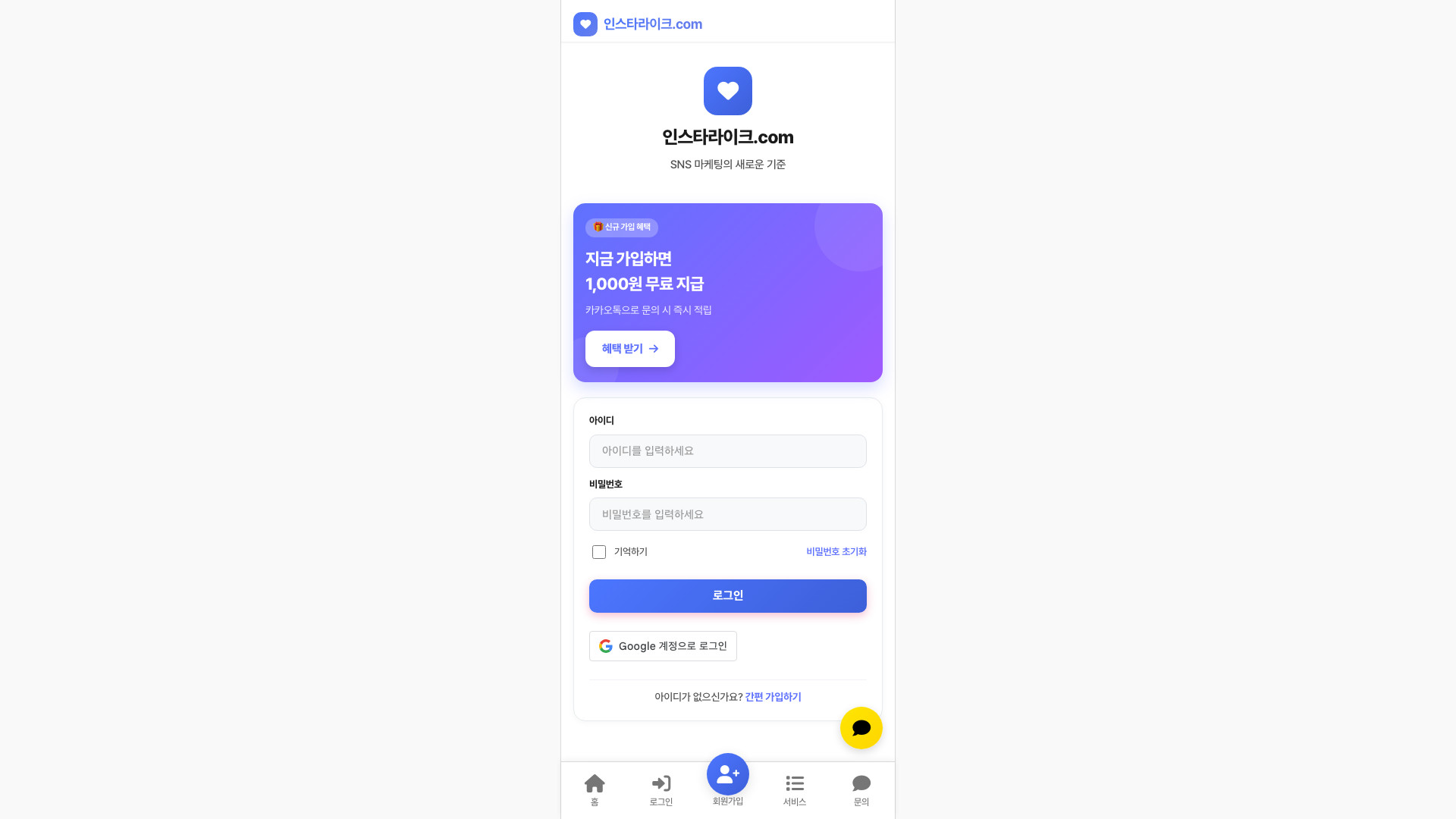 홈>SNS 마케팅>인스타라이크인스타라이크⭐ 0(0개 리뷰)|조회 16로그인 | 인스타라이크 - 팔로워 100명 단돈 1,000원부터카테고리SNS 마케팅웹사이트https://xn--oi2bo5swydna775iloa.com/🔖 북마크✏️ 리뷰 작성서비스 소개리뷰 (0)연락처서비스 설명🎁 지금 무료 팔로워 100명 이벤트 진행중! 인스타 팔로워·좋아요 국내 최저가 ⚡3초 자동처리. 10만명이 선택한 1위 플랫폼, 가입만 해도 1,000원 즉시 지급같은 카테고리의 다른 업체